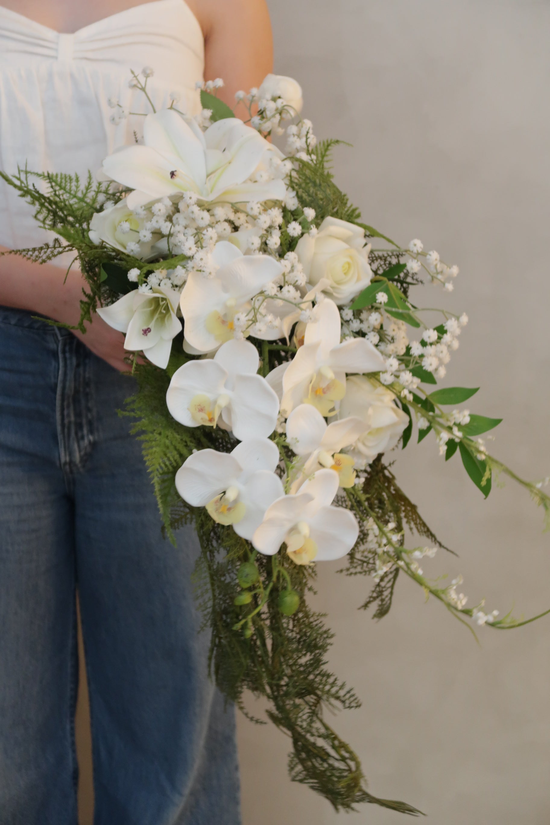 is a soft, cascading bouquet that embodies purity, grace, and timeless romance. Featuring luxurious white lilies, phalaenopsis orchids, classic ivory roses, and clouds of baby’s breath, this arrangement flows naturally into a gentle waterfall silhouette framed by soft greenery.