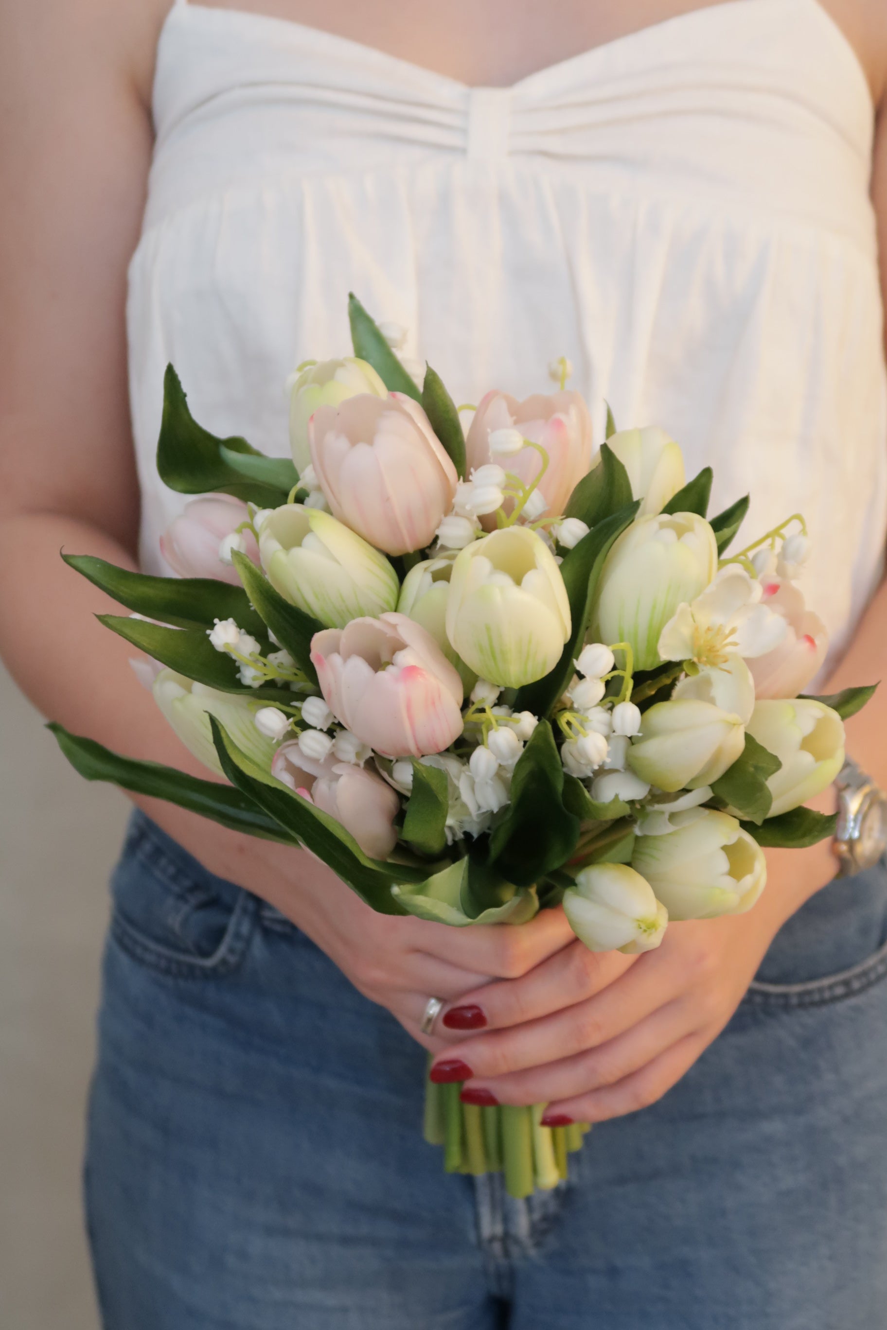 is a sweet, uplifting bouquet inspired by the gentleness of early spring. Featuring pastel tulips in soft blush, cream, and subtle green tones, paired with clusters of lily-of-the-valley–style mini blooms, this arrangement feels fresh, youthful, and quietly joyful.