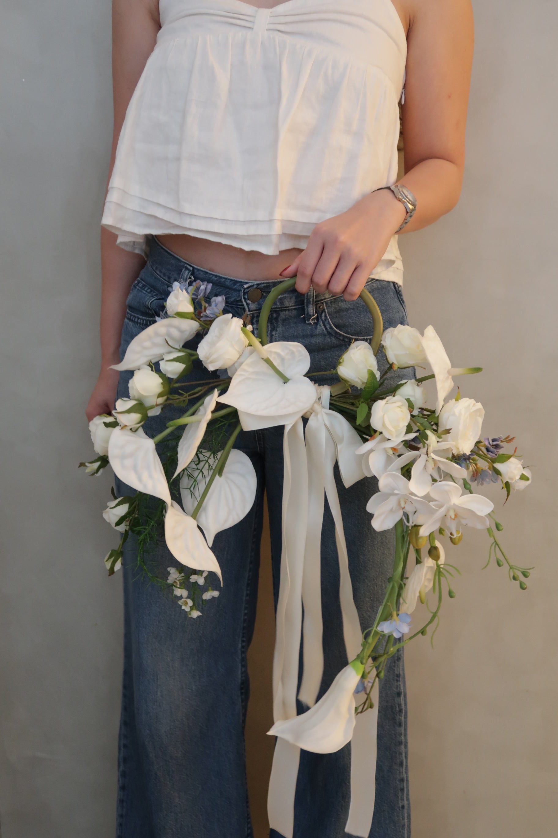 is a contemporary crescent-shaped bouquet designed for the bride who loves minimalism with a touch of artistry. This unique handheld arrangement features sculptural white anthuriums, delicate phalaenopsis orchids, soft white roses, and subtle hints of pastel blue blooms — all gathered around a sleek curved handle.