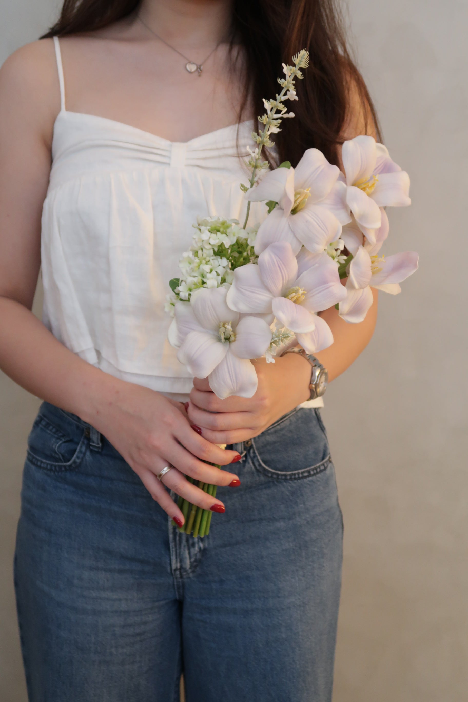 is a delicate, airy bouquet designed for those who adore subtle beauty and effortless charm. Featuring soft lilac blooms with a gentle watercolor-like wash, paired with petite white florals, this arrangement embodies serenity, sweetness, and quiet femininity.